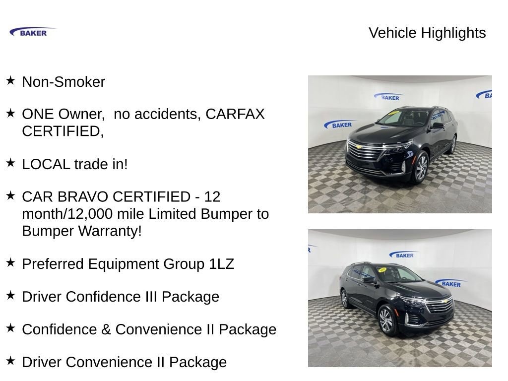 New Price! Mosaic Black Metallic 2023 Chevrolet Equinox Premier AWD 6-Speed Automatic Electronic with Overdrive 1.5L DOHC Non-Smoker, ONE Owner, no accidents, CARFAX CERTIFIED,, LOCAL trade in!, CAR BRAVO CERTIFIED - 12 month/12,000 mile Limited Bumper to Bumper Warranty!, Equinox Premier, 1.5L DOHC, 6-Speed Automatic Electronic with Overdrive, AWD, Mosaic Black Metallic, Jet Black Leather, 18 Aluminum Wheels, 2 Rear USB Charging-Only Ports, 2-Way Power Driver Lumbar Control Seat Adjuster, 3.87 Final Drive Axle Ratio, 6-Speaker Audio System Feature, Adaptive Cruise Control, Automatic Front & Rear Parking Assist, Automatic temperature control, Bluetooth® For Phone, Confidence & Convenience II Package, Driver 8-Way Power Seat Adjuster, Driver Confidence III Package, Driver Convenience II Package, Front dual zone A/C, Front Passenger 4-Way Manual Seat Adjuster, Front Passenger 8-Way Power Seat Adjuster, HD Surround Vision, Heated Driver & Front Passenger Seats, Heated front seats, Heated steering wheel, Memory seat, Power driver seat, Power Liftgate, Preferred Equipment Group 1LZ, Radio: Chevrolet Infotainment 3 Plus System, SiriusXM Radio, Ventilated Driver Seat, Ventilated Front Passenger Seat, Wireless Apple CarPlay/Wireless Android Auto.