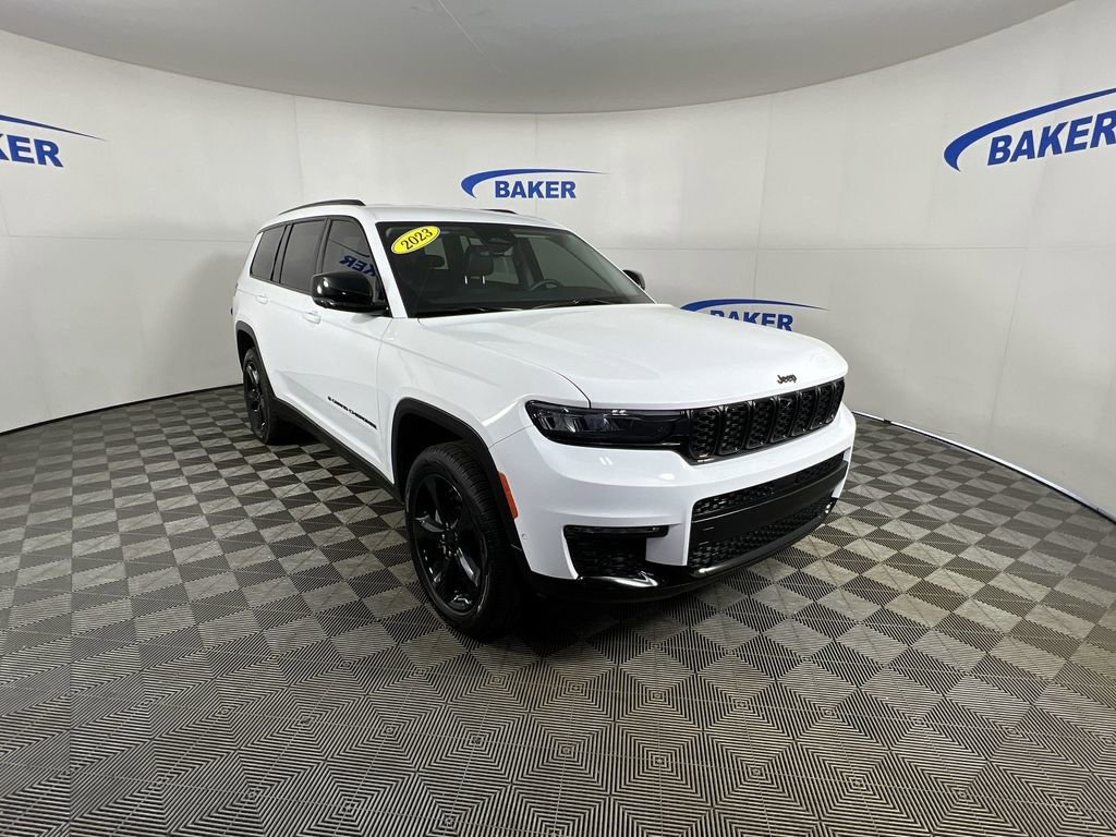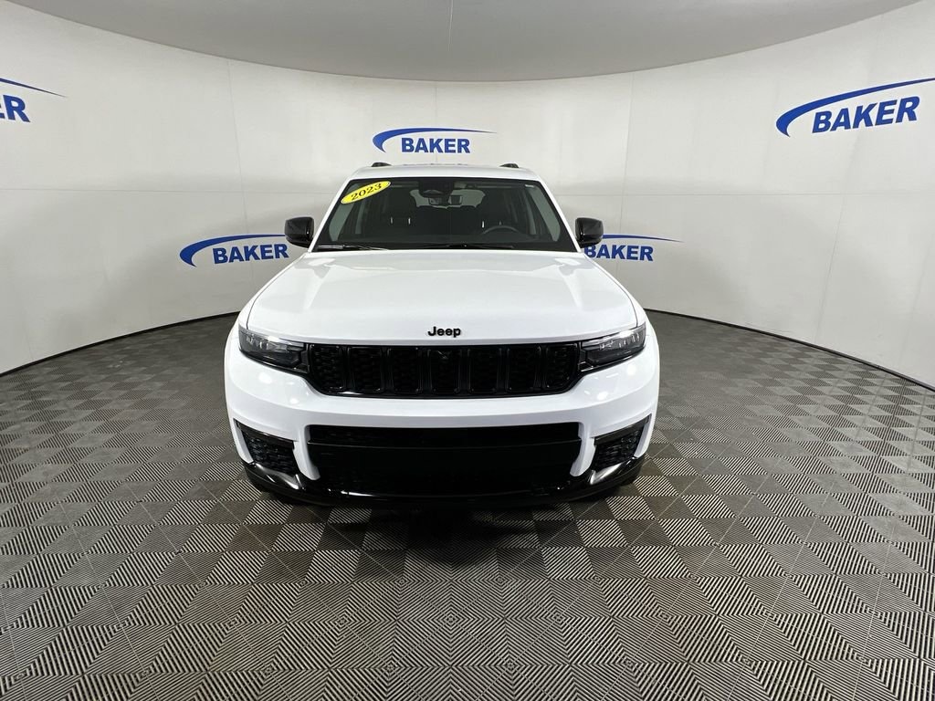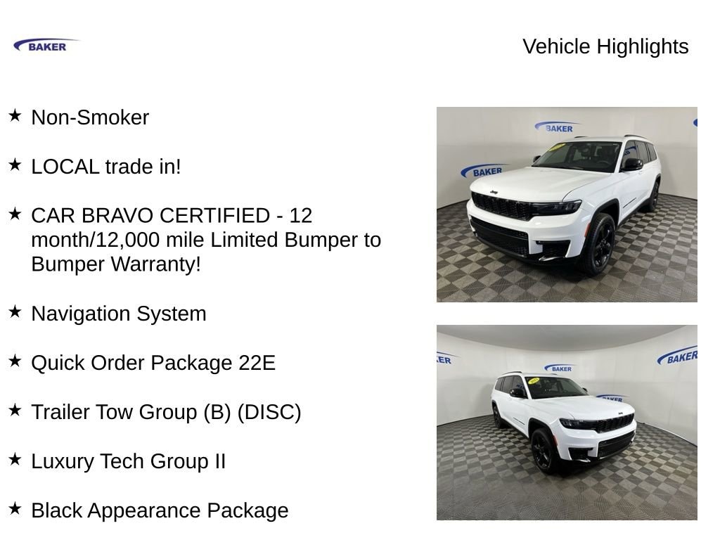 Bright White Clearcoat 2023 Jeep Grand Cherokee L Limited 4WD 8-Speed Automatic 3.6L V6 24V VVT Non-Smoker, LOCAL trade in!, CAR BRAVO CERTIFIED - 12 month/12,000 mile Limited Bumper to Bumper Warranty!, Grand Cherokee L Limited, 4D Sport Utility, 3.6L V6 24V VVT, 8-Speed Automatic, 4WD, Bright White Clearcoat, 220 Amp Alternator, 2nd Row Manual Window Shades, Auto-Dimming Exterior Driver Mirror, Automatic Headlamp Leveling System, Black Appearance Package, Capri Leatherette w/Axis II Seats, Gloss Black Exterior Accents, Heavy-Duty Engine Cooling, Integrated Off-Road Camera, Intersection Collision Assist System, Luxury Tech Group II, Memory Steering Column, Molded In Color Black/Gloss Black Roof Rails, Navigation System, ParkSense Front/Rear Park Assist w/Stop, Passive Entry - Front/Rear Doors, Liftgate, Power Tilt/Telescope Steering Column, Quick Order Package 22E, Rain Sensitive Windshield Wipers, Rear Back Up Camera Washer, Rear Load Leveling Suspension, Rearview Autodim Digital Display Mirror, Surround View Camera System, Trailer Hitch Zoom, Trailer Tow Group (B) (DISC), Ventilated Front Seats, Wheels: 20 x 8.5 Gloss Black Painted Aluminum, Wireless Charging Pad.
