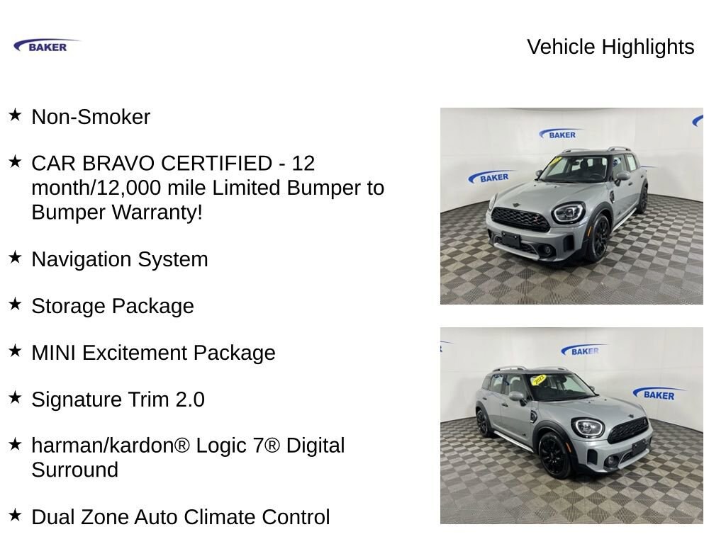 New Price! Moonwalk Gray Metallic 2023 MINI Cooper S Countryman Signature AWD 8-Speed Automatic Sport 2.0L I4 DOHC 16V Non-Smoker, CAR BRAVO CERTIFIED - 12 month/12,000 mile Limited Bumper to Bumper Warranty!, Cooper S Countryman Signature, 2.0L I4 DOHC 16V, AWD, Moonwalk Gray Metallic, Carbon Black Artificial Leather, Active Driving Assistant, Advanced Real-Time Traffic Information, Apple CarPlay Compatibility, Brake assist, Comfort Access Keyless Entry, Dual Zone Auto Climate Control, Electronic Stability Control, Exterior Parking Camera Rear, Front dual zone A/C, harman/kardon® Logic 7® Digital Surround, Heated door mirrors, Heated Front Seats, MINI Driving Modes, MINI Excitement Package, MINI Navigation, Navigation System, Power moonroof, Rear Park Distance Control, Remote keyless entry, Roof in Body Color, Signature Trim 2.0, Storage Package, Traction control, Wheels: 18 x 7.5 Pair Spoke Alloy.